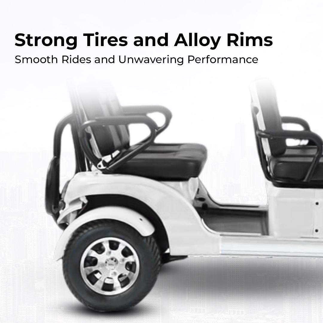 Safety is at the heart of the Gulf Buggy Evolution’s design. This electric golf cart has high-tech safety features, ensuring smooth, controlled rides on every terrain. With anti-skid tires, hydraulic brakes, and a stable 4-wheel frame, you can trust this cart to keep you secure.