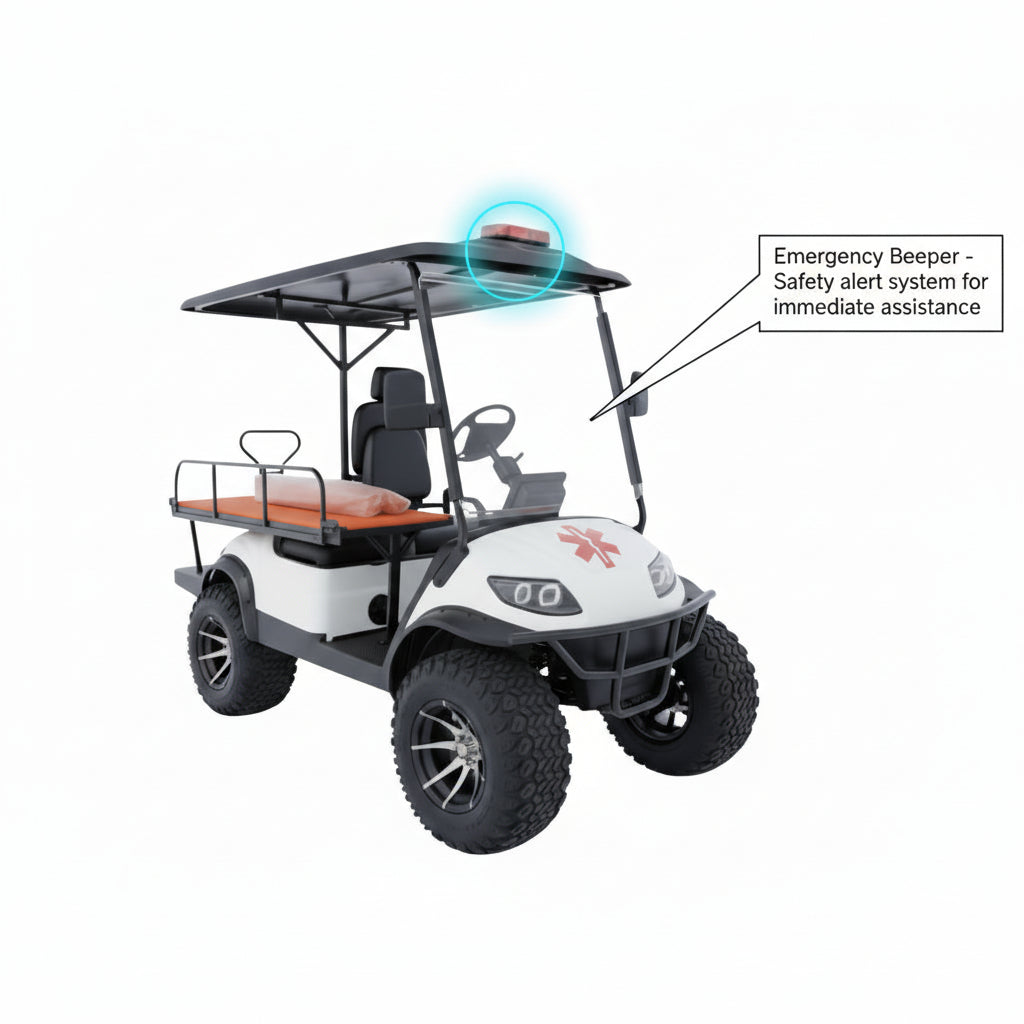 The Keon Golf Cart Premium 2 Seater Electric Ambulance Buggy Car is specially designed for emergency medical mobility in hospitals, resorts, airports, industrial sites, and large facilities. Built with a durable chassis and an advanced suspension system, this ambulance E car ensures safe and smooth patient transportation.
