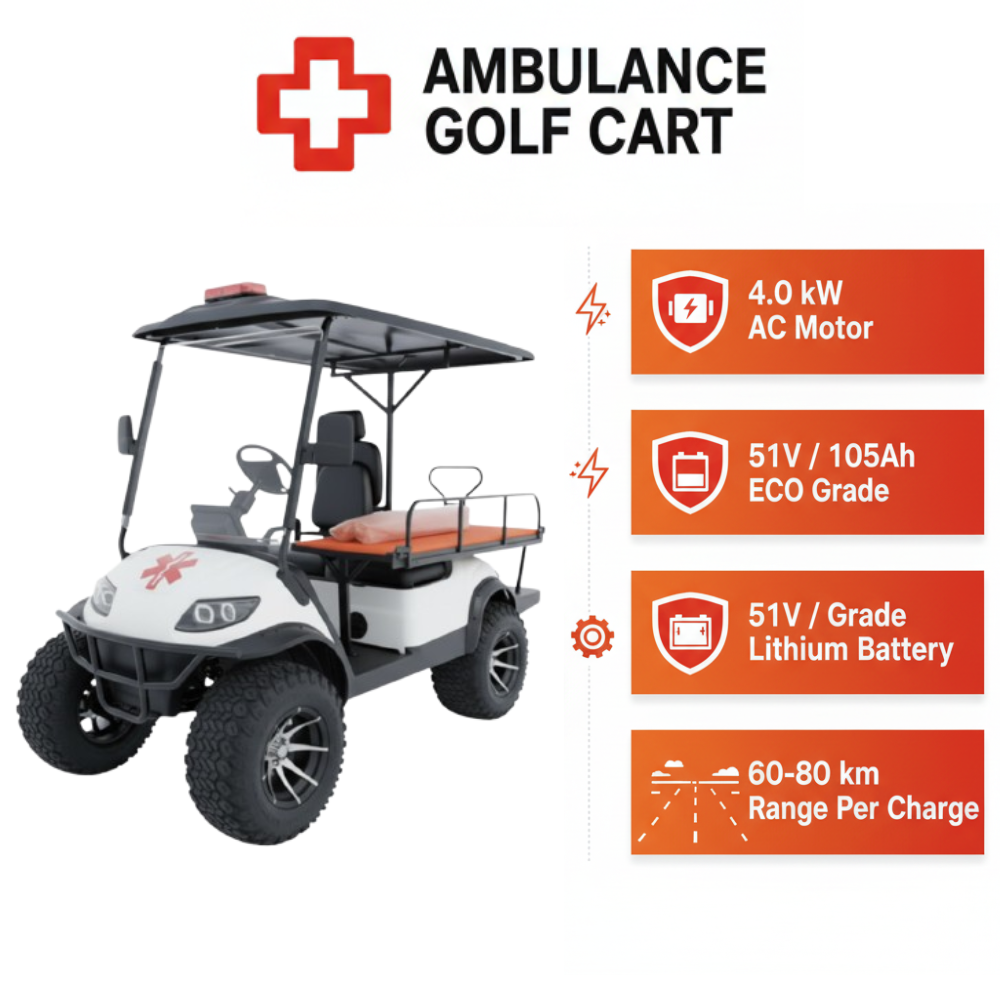 Powered by a 4.0 kW AC Motor and a high-capacity 51V / 105Ah ECO Grade Lithium Battery, the ambulance cart delivers dependable torque and extended driving range of up to 60–80 km per charge. This ensures uninterrupted emergency readiness throughout operational shifts.