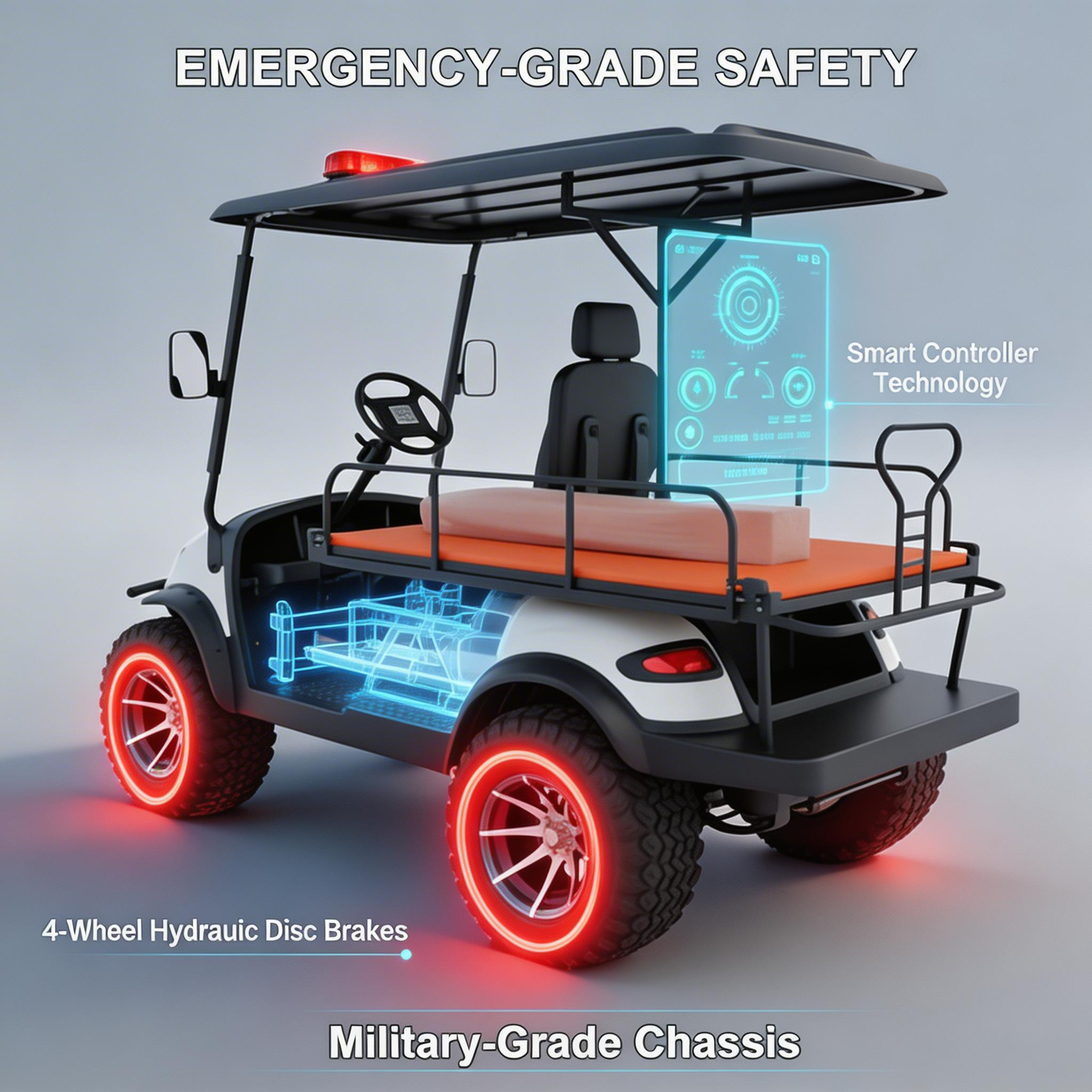 Equipped with 4-wheel premium hydraulic disc brakes, programmable controller technology, and reinforced chassis engineering, the ambulance cart ensures precise control and safe stopping performance even under emergency driving conditions.